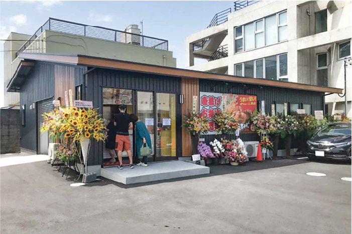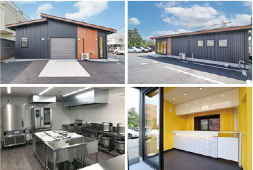 奥行き12mを活かし、奥行き方向に搬入口を設置。店舗設計の会社とタッグが組まれたことで、動線とHACCP対策を考慮した内装が完成。三角形のお洒落な切妻屋根のデザインが店舗のイメージをお洒落なものにしています。
