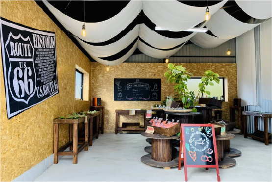 ガレージの利用法はオイルの香りの世界だけではありません。 野菜や果物、手作り品を並べたマルシェなら、小さなサイズながらもお洒落度は抜群の「切妻Miniシリーズ」がぴったり。気の合う仲間と一緒にワイワイしながらのオープンもいいですね。