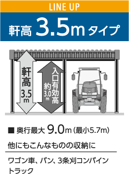 間口は用途に合わせて、つなぎ合わせ、奥行きも最大9mまで高さは3m~6mを自在に組み合わせできます。工場規格品にすることにより、そのバリエーションは600種類以上になります。