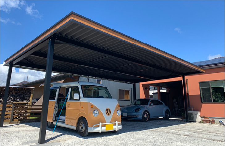 すべての梁に頑丈なH鋼を使用しているため、奥行きのなかに中間柱を置く必要がありません。開口部も広いので、前からも横からも車の出し入れがカンタンに。カーポートの他、作業場や出荷場、直売所の用途にもピッタリなデザインです!